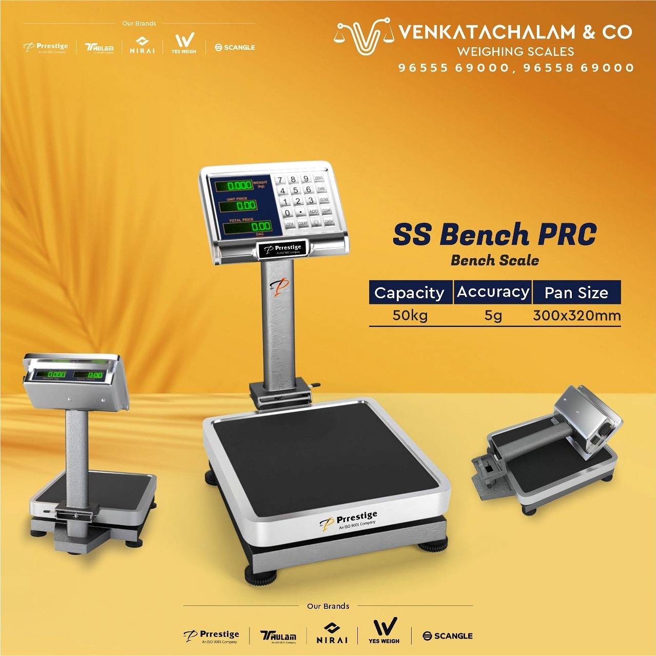 Price computing scales are available with excellent features SS Bench PRC - Price Computing scale. LED front and back Green display with 50 kg capacity and Load Cell with plastic waterproof cover.